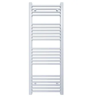 Der weiße Handtuchwärmer-Heizkörper misst 1200 x 450 mm mit geraden Rohren mit einem Mittenabstand von 400 mm