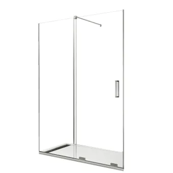 Elegante begehbare Duschwand aus gehärtetem Glas mit Kalkschutz, 8 mm, Höhe 195 cm. Griff aus Edelstahl. Designräder, geschützt durch zwei verchromte Metallplatten