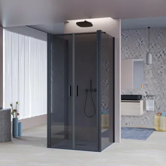 Duschkabine bestehend aus einer Salonduschtür mit zwei Türen und 2 festen Seiten, aus 6 mm dickem grauem Sicherheitsglas mit Antikalk-Behandlung, Aluminiumprofilen mit mattschwarzer Oberfläche, Serie Mylas