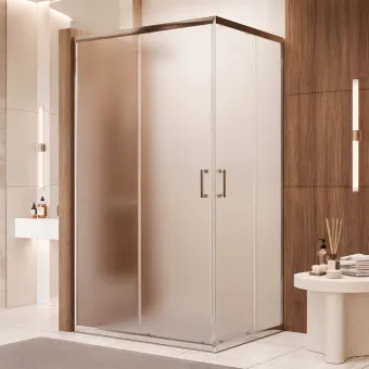 Zweiseitige Duschkabine mit Ecköffnung. Glatte Satinierung auf zwei Seiten, doppeltes Schiebeglas. Höhe 195 cm mit Anti-Kalk-Behandlung . Einbautoleranz -20 mm +0,5 mm pro Seite.