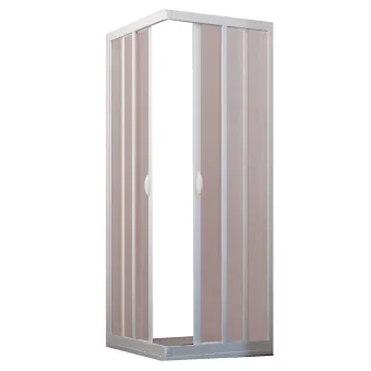 Duschabtrennung aus Acryl mit Schiebeöffnung in der Ecke. Weiße, matte PVC-Profile, die auf kleinere als die...