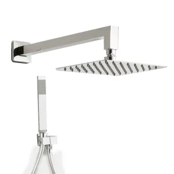 Quadratische verchromte Duschlösung bestehend aus 2 mm dickem Stahlduschkopf, Duscharm, flexiblem PVC-Schlauch, Handbrause aus Messing und Halterung. Erhältlich mit Lösungen in verschiedenen Größen 20x20, 25x25 und 30x30