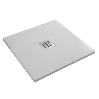 Duschwanne mit Mittelloch Ardesia aus weißem Harzmarmor mit Edelstahlrost. Niedriger Ablauf für Duschwanne im Preis inbegriffen, Ablaufleistung 42 l pro Minute. Doppelte Inspektion mit Haarstoppgitter. Duschwanne Hellgrau RAL 7047. Hergestellt in Italien, beschichtet mit 2 mm Marine-Gelcoat. 26 % Harz, 74 % Dolomitpulver. Reduzier- und schneidbare Duschwanne für nicht quadratische Duschwannen