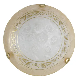 Runde Deckenleuchte , 30 cm Durchmesser, aus bernsteinfarbenem weißem Glas mit goldfarbener stilisierter...