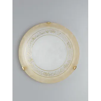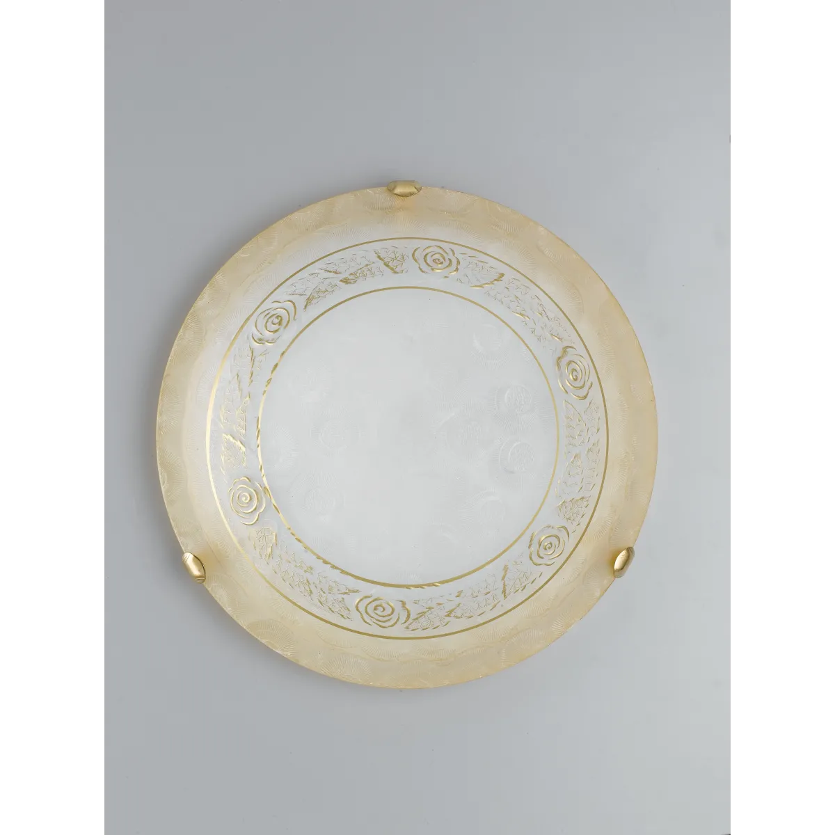 Runde Deckenleuchte , 40 cm Durchmesser, aus bernsteinfarbenem weißem Glas mit einem Band, das mit stilisierten goldenen Rosen verziert ist. Lampe , die an der Wand oder Decke montiert werden kann . Rosige Linie , klassisch , in der Lage, jeder Umgebung Eleganz zu verleihen. 2 Halogenlampen nicht im Lieferumfang enthalten, 60 Watt, E27-Fassung. Siehe auch im Durchmesser 30 cm . Entdecken Sie die gesamte Rosy-Linie. Klicken Sie hier.