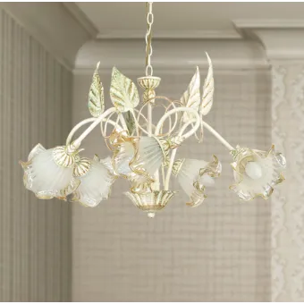 Weißer und grüner 5-flammiger Hängeleuchter mit Metallstruktur und floralen Lampenschirmen aus champagnerfarbenem Glas. E14-Halogenlampen, je 40 Watt, nicht im Lieferumfang enthalten. Auch in der 3-Licht-Version erhältlich. Hängeleuchter mit 5 40-Watt-E14-Anschlüssen. Kann an der Decke montiert werden. Maße in cm HxL 100x62. Leuchtmittel im Lieferumfang enthalten ja/nein: Nein. Kompatibel mit LED- oder Halogenleuchtmitteln. Farbe: Champagner. Zweite Farbe: Grün.