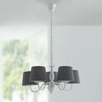 Höhenverstellbare Kettenaufhängung aus weißem Metall mit grauen Stofflampenschirmen. Klassischer Kronleuchter...