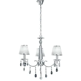 Metallkettenaufhängung , höhenverstellbar , mit glitzernden weißen Polyvinyl-Lampenschirmen und K9-Kristallanhängern. Klassischer Kronleuchter , der jeder Umgebung Glanz verleiht. Boeme- Linie, ideal für diejenigen, die der Einrichtung eine elegante Note verleihen möchten. 3 Halogenleuchtmittel nicht im Lieferumfang enthalten, 40 Watt, E14-Fassung. Entdecken Sie die gesamte Boeme-Linie. Klicken Sie hier.