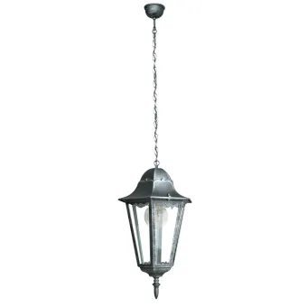Aus der Linie des Zubehörs für Außenbeleuchtung: Pendelleuchter der Koln-Serie. Diese Serie zeichnet sich durch ihren Jugendstilstil mit einem antiken Look aus, der durch einen silberfarbenen Pinselstrich erreicht wird, der auf den schwarzen Hintergrund des Druckgussaluminiums aufgetragen wird, um der Struktur ein weniger dunkles und brillanteres Aussehen zu verleihen. Ideales Einrichtungszubehör für öffentliche Gärten, Eigentumswohnungen oder private Bereiche. Glühbirne nicht im Lieferumfang enthalten.
