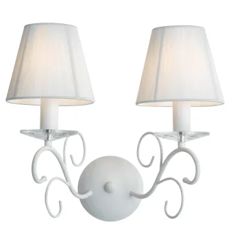 Wandleuchte aus weißem Metall mit Stofflampenschirmen und K9-Kristalloberflächen. Wandleuchte mit geschwungenen Verzierungen, ideal für die Schaffung von Lichtpunkten in der Umgebung. Klassische und elegante Perla- Linie . 2 Halogenleuchtmittel nicht im Lieferumfang enthalten, 40 Watt, E14-Fassung. Entdecken Sie die gesamte Perla-Linie. Klicken Sie hier.