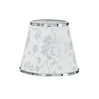 Lampenschirm für Hängeleuchter und Wandleuchte aus weißem Stoff mit Blumendekor und Chromrändern, 14 cm breit, E14-Fassung. Auch mit einer Breite von 25 cm erhältlich. Lampenschirm mit E14-Fassung mit den Maßen HxL 14x12 cm. Weiße Farbe. Zweite Farbe: Chrom.