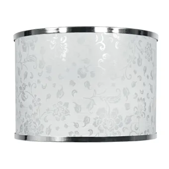 Lampenschirm für Tischlampe mit kreisförmiger Struktur, Durchmesser 35 cm, aus weißem Stoff, Blumendekor und verchromten Kanten, E27-Fassung. Auch mit einer Breite von 12 cm erhältlich. Lampenschirm mit E27-Fassung in den Maßen HxL 25x35 cm. Weiße Farbe. Zweite Farbe: Chrom.