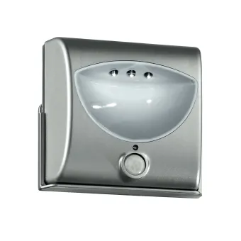Verchromte Wandleuchte, 8 cm hoch und 9,5 cm breit, mit verstellbarer Struktur, batteriebetrieben und Bewegungssensor. Im Lieferumfang sind 3 LED-Leuchtmittel mit jeweils 0,075 Watt und 4500 Kelvin enthalten. LED-Wandleuchte mit 3 SMD-Leuchtmitteln à 0,075 Watt, montierbar an der Wand. Maße in cm HxL 8x9,5. Leuchtmittel im Lieferumfang enthalten ja/nein: Ja Klasse A+ ab Kelvin 4500 Lumen 20. Farbe: Silber.