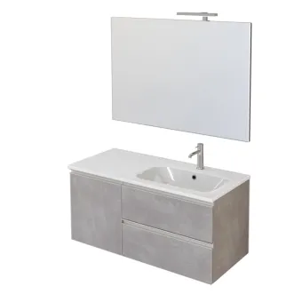 Hängeschrank mit einer Breite von 100 cm in warmgrauer Betonoptik, der trotz seiner geringen Abmessungen dank der zwei Schubladen und der Tür , die im Inneren ein zusätzliches verstellbares Regal verbirgt, eine optimale Nutzung des verfügbaren Platzes ermöglicht. Ideal für kleine Badezimmer, sorgt es für Ordnung und Sauberkeit, ohne auf einen modernen und minimalistischen Stil zu verzichten. Schubladen und Tür sind mit „C“-förmigen Metallgriffen mit satiniertem Nickel-Finish ausgestattet. Die Textur der Struktur ist erhaben und sorgt so für ein angenehmes Tastgefühl. Das integrierte Waschbecken mit glänzender Oberfläche verfügt über eine dezentrale Wanne und ist bereits mit einem Loch für Mischer und Überlauf ausgestattet. Der Spiegel mit polierten Kanten wird auf eine solide Platte aufgebracht, auf der die 25 cm große LED-Lampe installiert wird