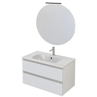 Platzsparender hängender Badezimmerschrank 80 cm der DUBON-Linie mit zwei gepolsterten Schubladen , mit modernem mattweißem Finish, integriertem Waschbecken, Ø80-Spiegel mit 30 cm A+ LED-Lampe