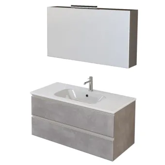 Hängeschrank mit einer Breite von 100 cm in warmgrauer Betonoptik, der es Ihnen trotz seiner geringen Abmessungen dank der beiden Schubladen mit Soft-Close-Dämpfung ermöglicht, den verfügbaren Platz optimal zu nutzen. Ideal für kleine Badezimmer, sorgt es für Ordnung und Sauberkeit, ohne auf einen modernen und minimalistischen Stil zu verzichten. Schubladen mit „C“-förmigem Metallgriff mit satiniertem Nickel-Finish. Das integrierte Waschbecken mit glänzender Oberfläche ist bereits mit einem Loch für die Armatur und den Überlauf ausgestattet. Die Textur der Struktur ist erhaben und sorgt so für ein angenehmes Tastgefühl. Abgerundet wird die Komposition durch den Spiegel mit klappbarer Spiegeltür mit Soft-Closing und zwei Glasböden im Inneren, während die 30 cm große LED-Lampe oben montiert wird.