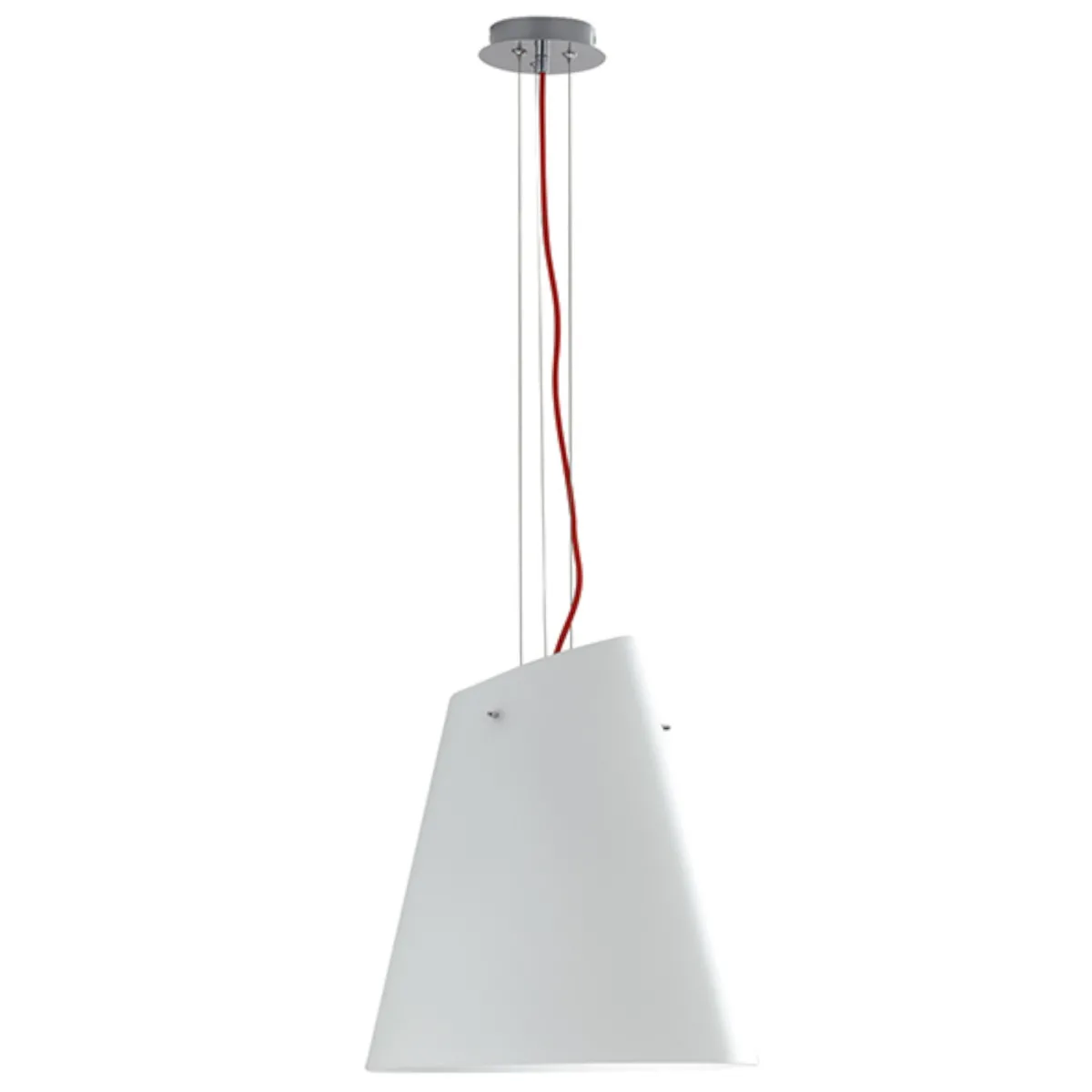 - Moderne verchromte Metallstruktur mit Lampenschirm aus Opalglas und rotem Stoffkabel.