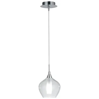 Aus der Zubehörlinie für Innenbeleuchtung, Pendelleuchte aus der Blinder-Serie. Ein moderner und funktionaler Kronleuchter, der nicht unbemerkt bleiben möchte, aber dank der technischen Lösung der doppelten Glaskammer, der äußeren transparent und der inneren weiß satiniert, gleichzeitig die breiteste Lichtstreuung bietet. Das Design wird durch das Vorhandensein glänzender verchromter Metalldetails zusätzlich bereichert.