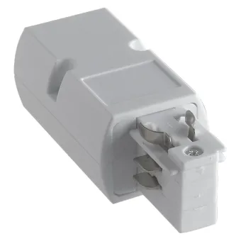 Rechte Kupplung für Führungsschienen, LN-Eingang mit Erdungskabel für Dreileiterschaltung. Weiße Farbe. Auch in Schwarz erhältlich.