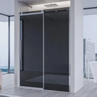 Duschtür ohne Profile, rauchschwarzes Euklid – 8 mm dickes Hartglas H195 mit Antikalk- Edelstahlgriffen . Schnellverschluss für einfache Wartung. Türtoleranz -3cm. Magnetverschluss. Räder aus Edelstahl AISI 304 . 8 mm gehärtetes Kristall. Schiebeöffnung