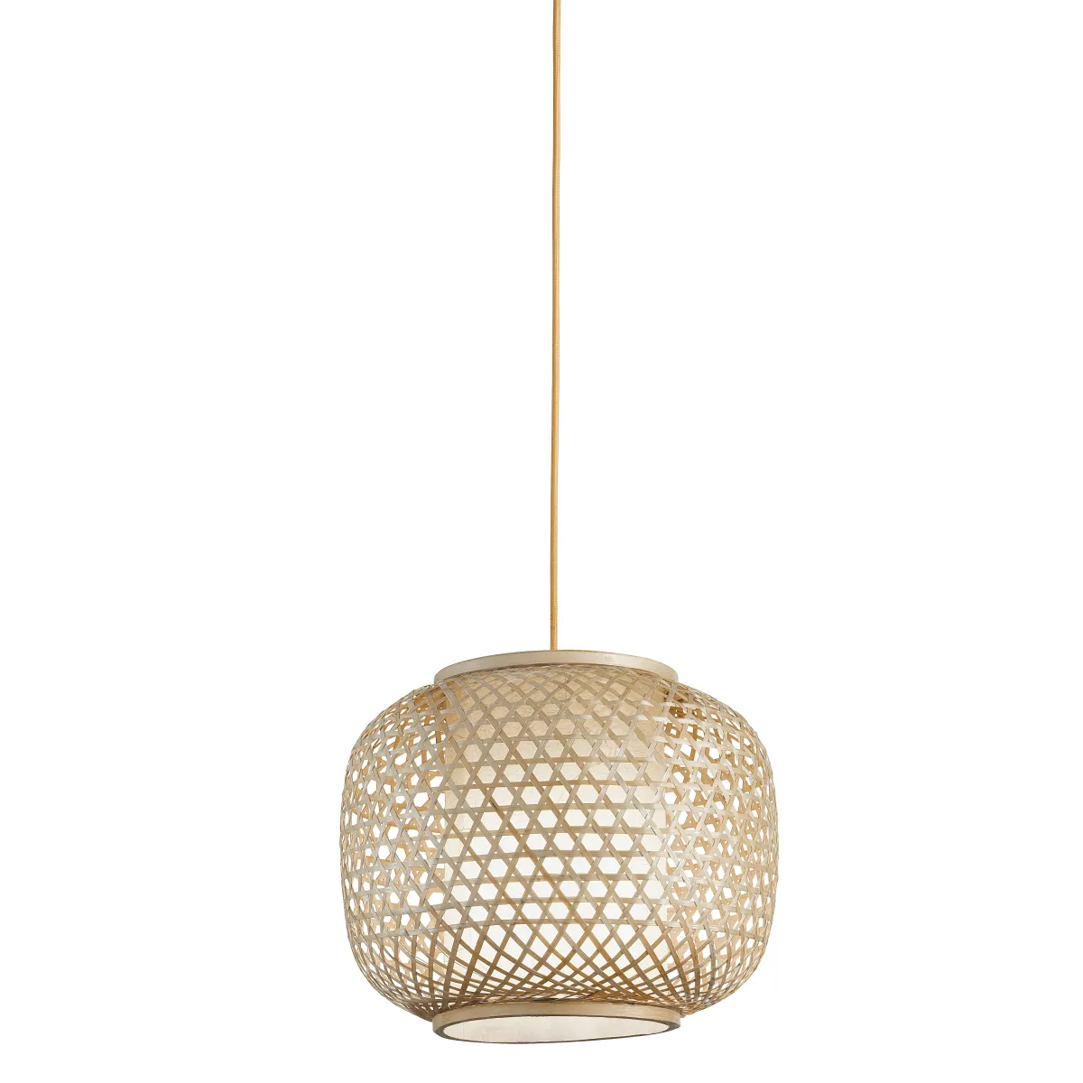 Pendelleuchte mit gewebter natürlicher Bambusdekoration, Einzelleuchte. 60 Watt Halogenlampe, E27-Fassung, nicht im Lieferumfang enthalten. Pendelleuchte mit 1 60-Watt-E27-Fassung. Kann an der Decke montiert werden. Maße in cm HxL 110x30. Leuchtmittel im Lieferumfang enthalten ja/nein: Nein. Kompatibel mit LED- oder Halogenleuchtmitteln. Farbe: Bambus.