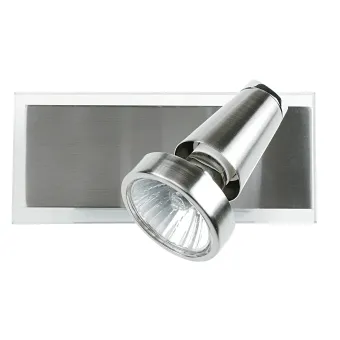 Einflammige Wandleuchte mit nickelfarbener Struktur aus gebürstetem Metall und Glasumrandung, 12 cm hoch und 17 cm breit. Inklusive Halogenleuchtmittel, 42 Watt und 2700 Kelvin, GU10-Fassung.