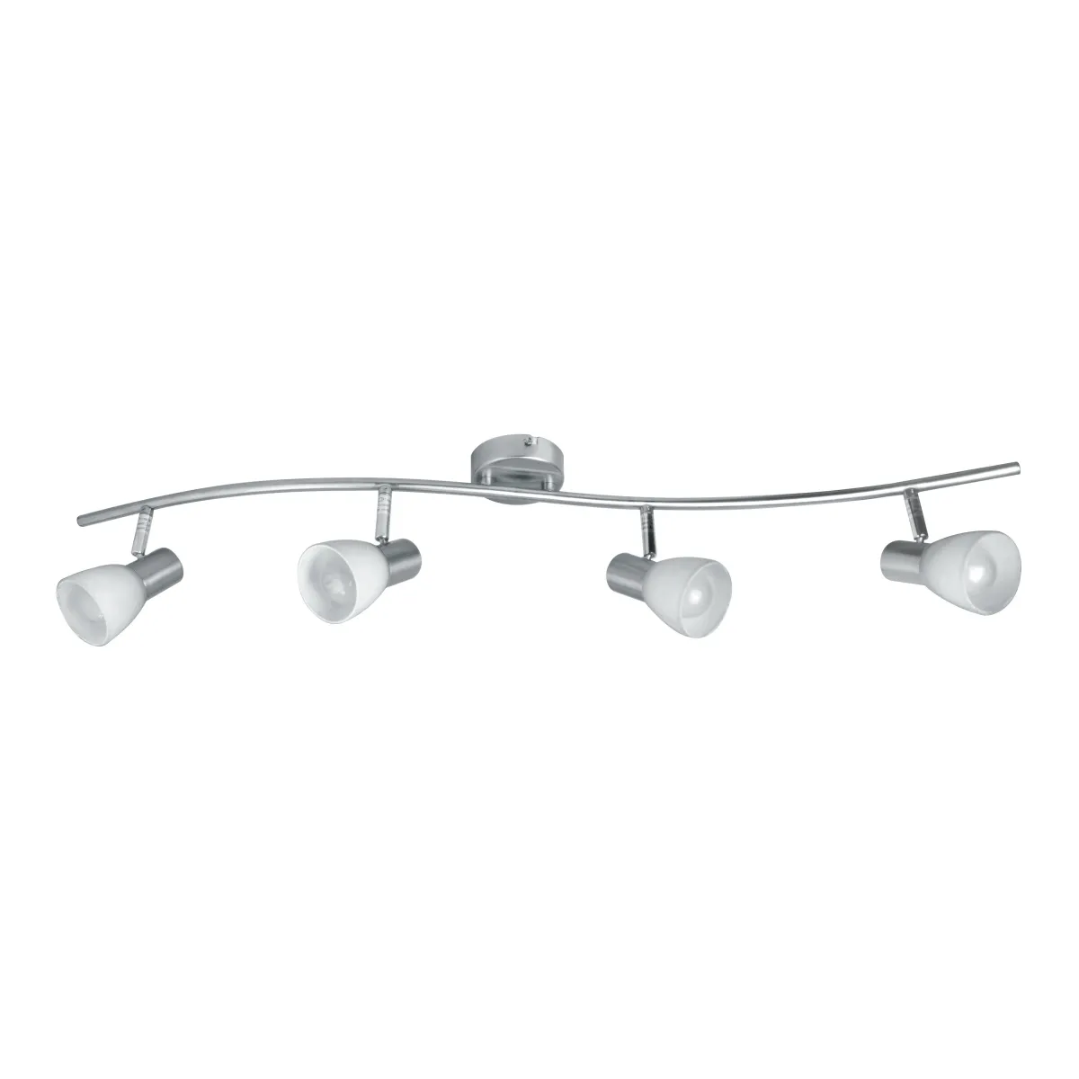 Minimalistischer Hängeleuchter mit 4 Halogenlampen (nicht im Lieferumfang enthalten), jeweils 40 Watt, GU10-Anschluss. Struktur aus satiniertem verchromtem Metall und Diffusoren aus schattiertem weißem Glas, 13,5 cm hoch und 93,5 cm breit. Deckenleuchte mit 4 40 Watt E14 Anschlüssen, montierbar an Wand oder Decke. Maße in HxL 13,5x93,5 cm. Leuchtmittel im Lieferumfang enthalten ja/nein: Nein. Kompatibel mit LED- oder Halogenleuchtmitteln. Farbe silber.