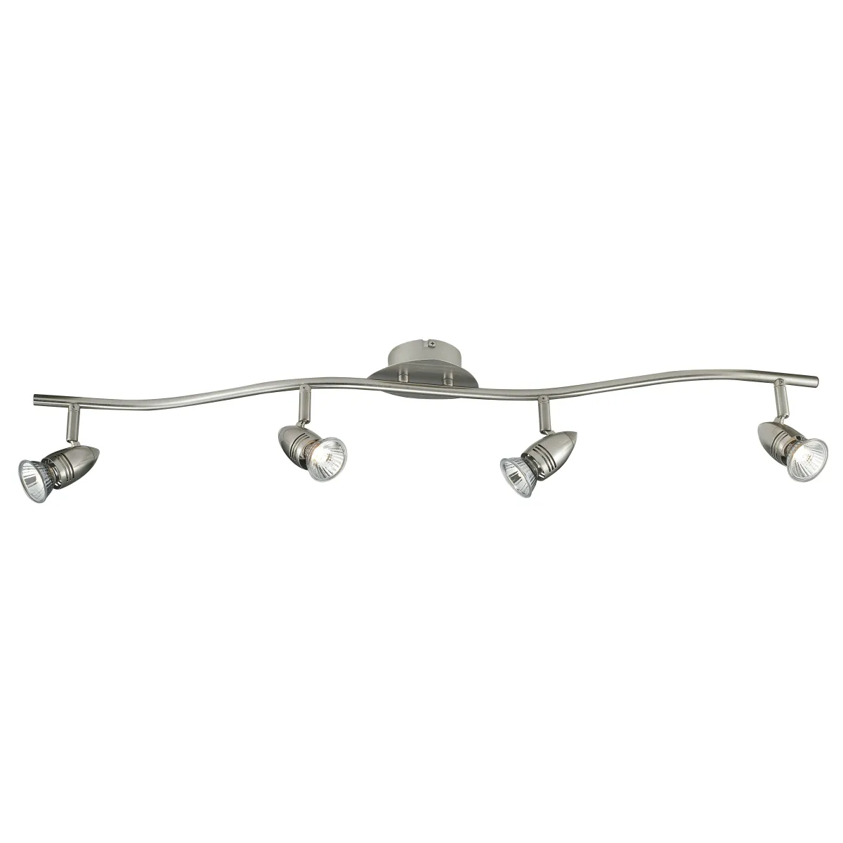 Kronleuchter mit Metallstruktur und nickelfarbener Oberfläche, 16,5 cm hoch und 94,5 cm breit, mit 4 Lichtern. Im Lieferumfang sind jeweils Halogenleuchtmittel mit 42 Watt und 2700 Kelvin, GU10-Fassung enthalten. Deckenleuchte mit 4 42 Watt GU10-Halogenlampen, montierbar an Wand oder Decke. Maße in cm HxL 16,5x94,5. Leuchtmittel im Lieferumfang enthalten: Ja/Nein: Ja, Klasse D, Kelvin 2700, Lumen 1500. Farbe: Silber.