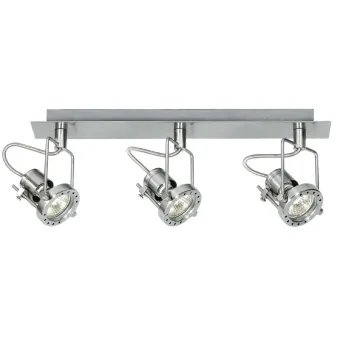 Verchromte Wandleuchte mit 3 Lichtern, mit Metallstruktur, 16 cm hoch und 45 cm breit. Im Lieferumfang sind jeweils Halogenleuchtmittel mit 42 Watt und 2700 Kelvin, GU10-Fassung enthalten. Deckenleuchte mit 3 42 Watt GU10-Halogenlampen, montierbar an Wand oder Decke. Maße in cm HxL 16x45. Leuchtmittel im Lieferumfang enthalten: Ja/Nein: Ja, Klasse D, Kelvin 2700, Lumen 1500. Farbe: Silber.