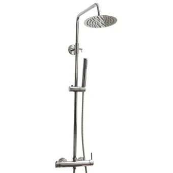 Colonne de douche modèle Pop avec mitigeur en laiton chromé, avec tige télescopique de 90 à 140. Pomme de douche de 20 cm de diamètre en acier inoxydable AISI 304 soudé. Robinet avec boutons en laiton chromé. Cette tringle de douche complète avec robinet est certainement un excellent compromis.