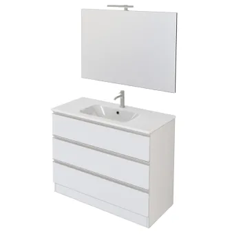 Meuble de salle de bain au sol ligne DUBON 100cm avec trois tiroirs amortis , avec une finition moderne blanc mat lisse, lavabo intégré, bord poli miroir 75x100 avec 25cm A + lampe led
