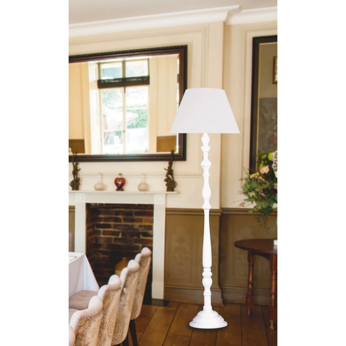 Lampe de terre blanc avec lampadaire en bois décoré et abat-jour en tissu, hauteur 155 cm. Comprend un bouton d'alimentation pression. Ligne Bourlesque reflète sous toutes ses formes un conception classique, donne à l'environnement une atmosphère intime vintage. Une lampe halogène de 60 watts non incluse, douille E27.