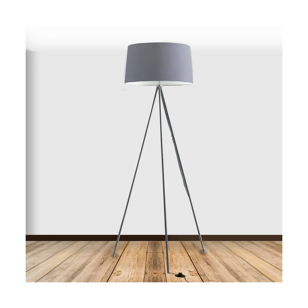 Lampadaire Trois pieds gris avec structure en métal et abat-jour en tissu. Équipé avec bouton allumage...