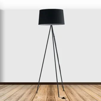 Lampadaire Trois pieds noir avec structure en métal et abat-jour en tissu. Équipé avec bouton allumage Manuel. Lampe de terre qui offre un bon éclairage et en même temps meuble. Ligne Marilyn idéal pour donner une touche moderne à l'environnement. Une lampe halogène de 60 watts non incluse, douille E27. Voir aussi en couleurs blanc est gris. Découvrez toute la ligne Marilyn, Cliquez ici.