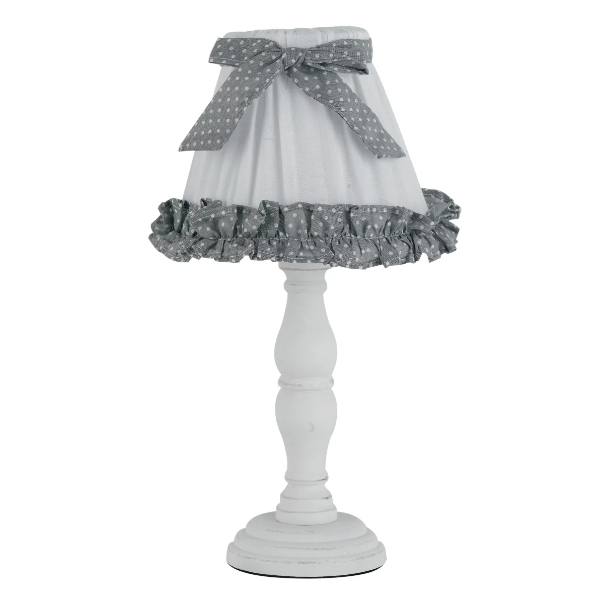 Abat-jour avec tige en bois blanc sculpté et abat-jour en tissu blanc et gris décoré d'un nœud. Lampe de Table de chevet Candy idéal pour ceux qui recherchent un conception classique vintage. Convient pour la décoration chambres d'enfants. Ampoule halogène 60 watts non incluse, douille E27.