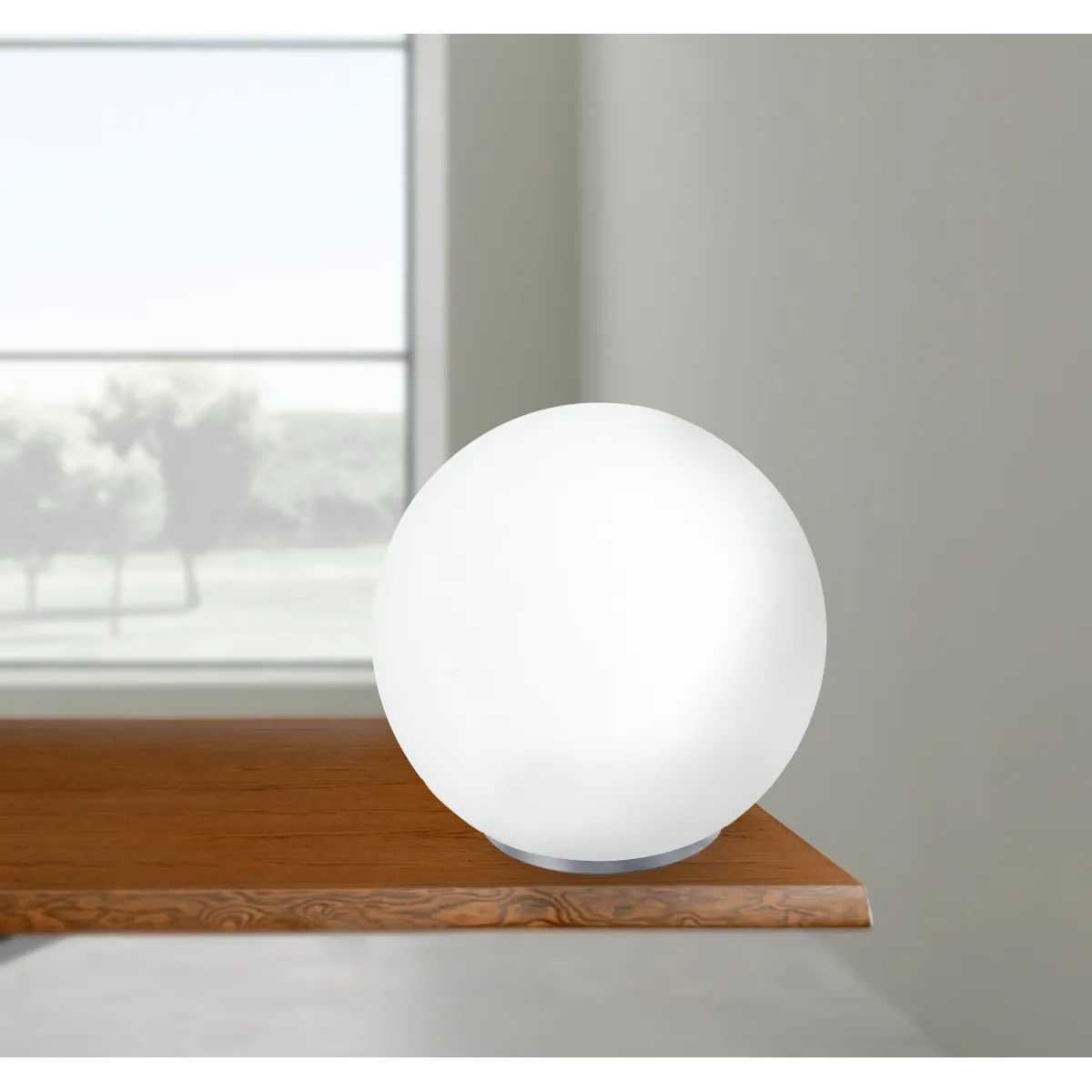 Lampe de table avec diffuseur globe, diamètre 15 cm, en verre blanc. Base chromée. Lampe de table moderne capable d'éclairer de manière homogène l'environnement. Idéal pour les grands et les petits. Ampoule halogène 60 watts non incluse, douille E27. Voir aussi dans les versions avec diamètre 20 cm est 35 cm. Découvrez toute la ligne City, cliquez ici.