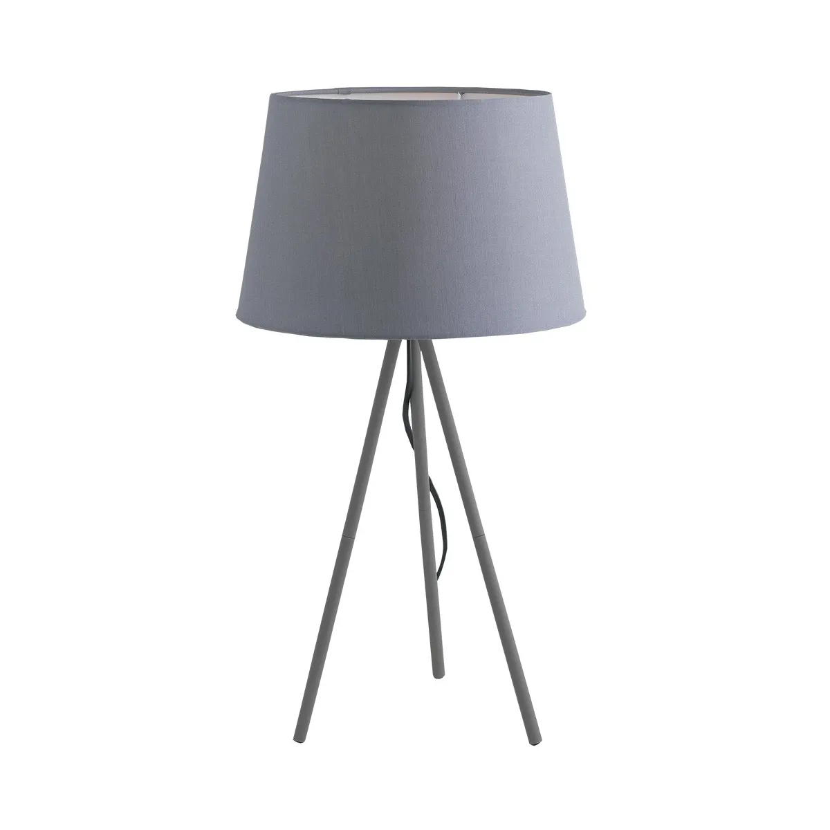 Lampe de table trépied gris avec structure en métal et abat-jour en tissu. Comprend bouton allumage Manuel...