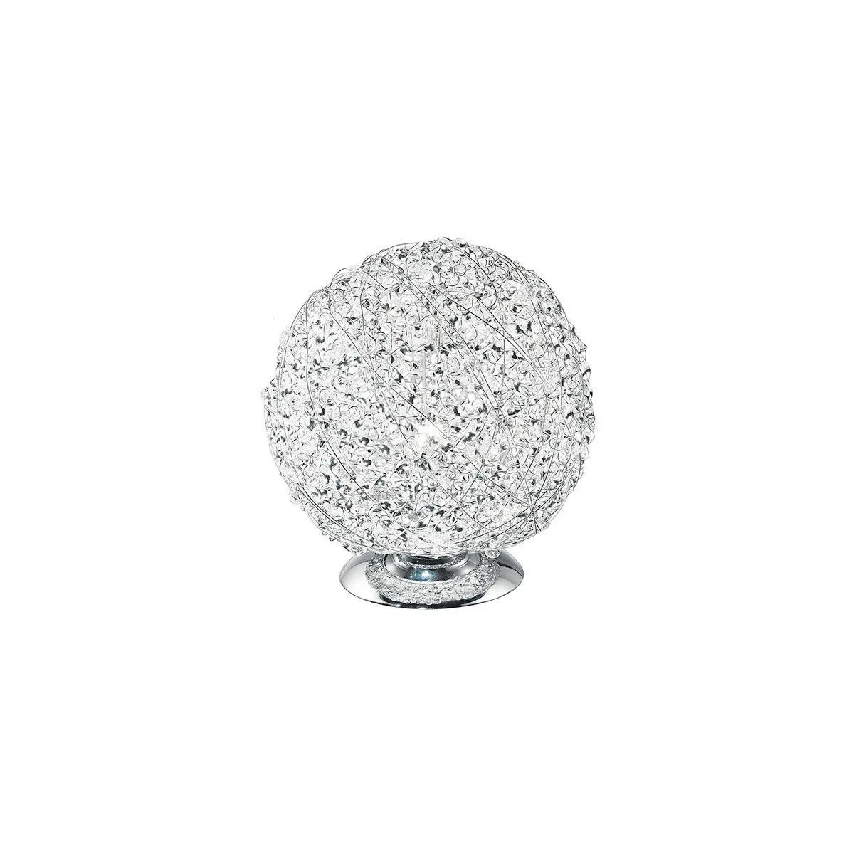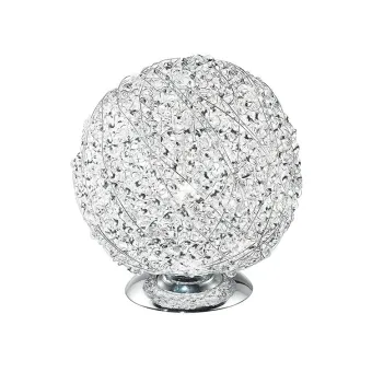 Lampe de table avec structure sphérique en aluminium et décoration en cristal, avec une lumière. Peut être installé sur une table de chevet. Ampoule halogène 60 watts non incluse, douille E27. Lampe de table Lampe de table Mesure en cm HxL 21x20. Ampoules incluses oui / non: Non. Il peut transporter 1 ampoule E27 de 60 watts maximum. Couleur: Chrome. Deuxième couleur: cristal.