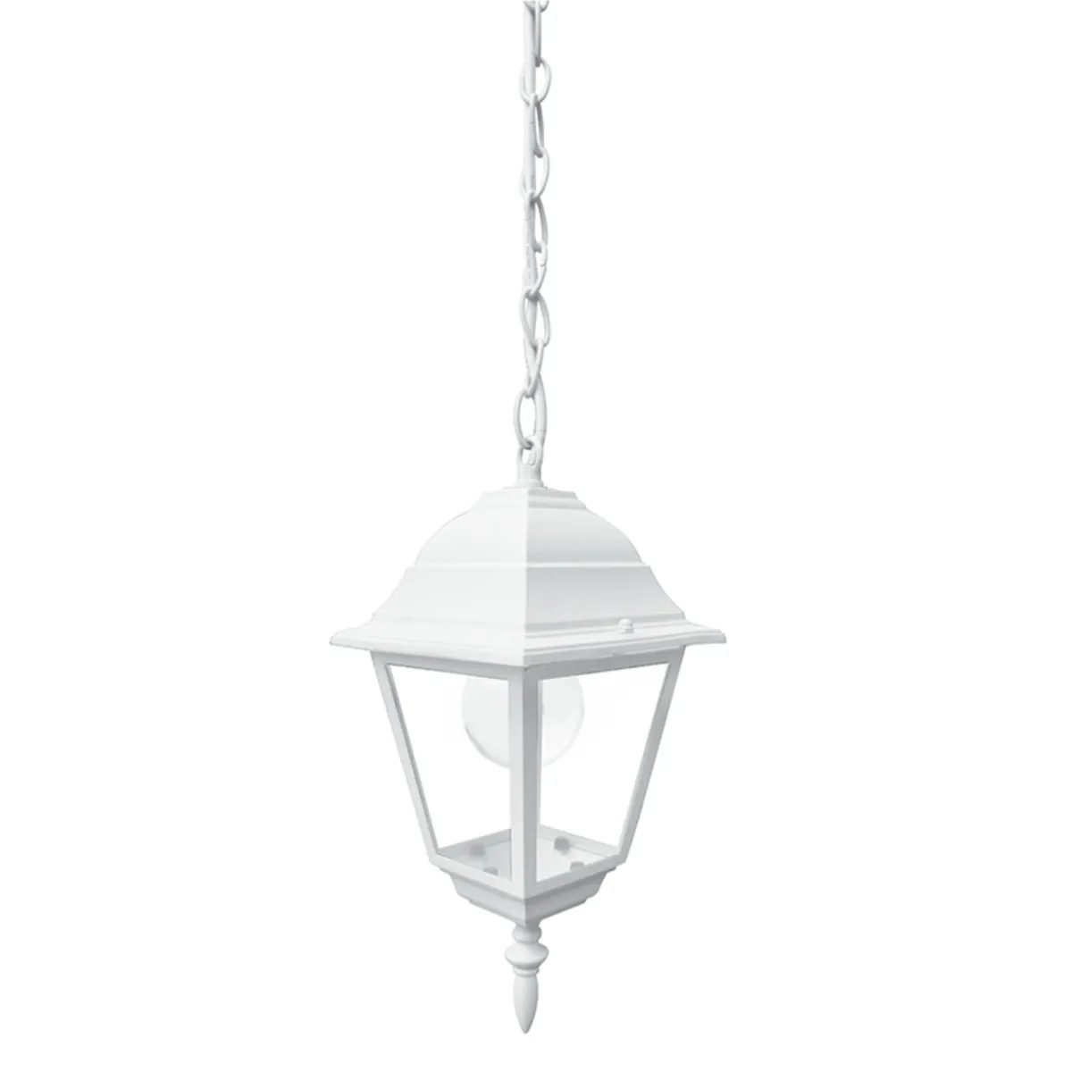 Lanterne suspendue avec diffuseur en verre et structure en aluminium moulé sous pression blanc, 11 cm de haut et 15 cm de large, avec une lumière. Ampoule halogène E27 de 40 watts non incluse. Également disponible en couleur anthracite.