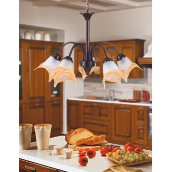 Lustre avec suspension à chaîne, réglable en hauteur, en métal couleur rouille peinte à la main et orateurs dans verre dessiné à la main, blanc et ambre. Là ligne 1162 propose des lampes qui reflètent un design classique. 5 lampes halogènes non incluses de 40 watts, douille E14. Voir aussi en version a 3 lumières. Découvrez toute la gamme 1162, cliquez ici.