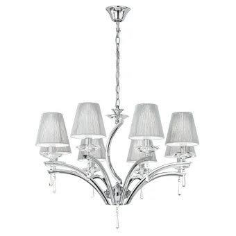 Lustre avec Suspension chaîne en métal, abat-jour en tissu argenté et cristaux K9, la taille Ajustable. Il donne une touche contemporaine au mobilier. Ligne Orchestre idéal pour l'ameublement classiques est moderne. 8 lampes halogènes non incluses de 40 watts, douille E14. Voir aussi en version a 3 est 5 lumières. Découvrez toute la gamme Orchestra, cliquez ici.