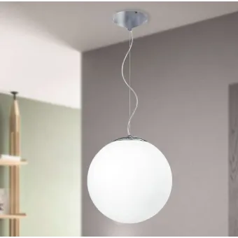 Suspension chromée avec abat-jour sphérique en verre blanc d'un diamètre de 35 cm. Ampoule halogène E27 de 60 watts non incluse. Disponible dans la version avec un diamètre supérieur à 45 cm. Pendentif Mesure en cm HxL 100x35. Ampoules incluses oui / non: Non. Il peut transporter 1 ampoule E27 de 60 watts maximum. Couleur blanche.