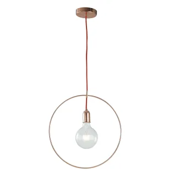Suspension à une lumière en métal cuivré avec abat-jour annulaire et fil de courant rouge. Ampoule halogène 60 watts non incluse, douille E27. Suspension avec 1 douille E27 de 60 W. Peut être installée au plafond. Mesure en cm HxL 120x40. Ampoules incluses oui / non: Non. Compatible avec les ampoules LED ou halogènes. Couleur: Cuivre.