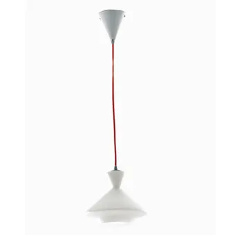Suspension simple avec cordon d'alimentation rouge, abat-jour en verre géométrique blanc et structure en métal blanc. Ampoule halogène E27 de 60 watts non incluse. Suspension avec 1 douille E27 de 60 W. Peut être installée au plafond. Mesure en cm HxL 120x20. Ampoules incluses oui / non: Non. Compatible avec les ampoules LED ou halogènes. Couleur blanche. Deuxième couleur: rouge.