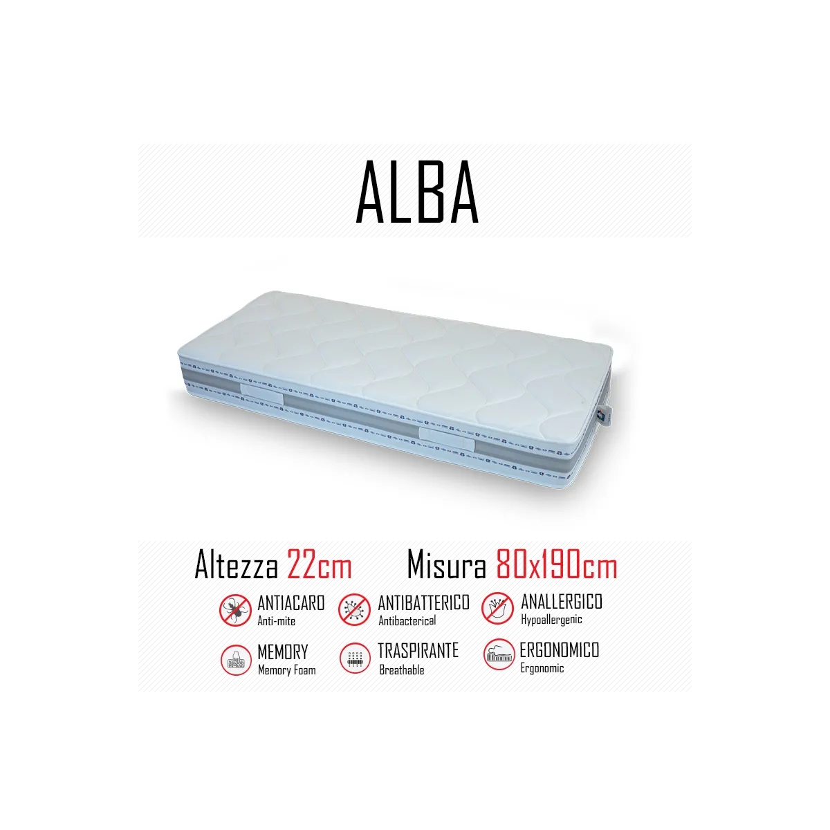 Matelas Alba composé d'une feuille de mousse à mémoire de 2 cm de hauteur, qui améliore la circulation en soulageant les points de pression, et d'une feuille de polyuréthane expansé qui le rend indéformable.