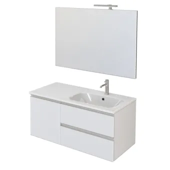 Meuble suspendu d'une largeur de 100cm en blanc opaque qui, malgré sa petite taille, permet de profiter au maximum de l'espace disponible grâce à la présence des deux tiroirs et de la porte qui dissimule une étagère réglable supplémentaire à l'intérieur. Idéal pour les petites salles de bain, en maintenant l'ordre et la propreté sans renoncer à un style moderne et minimal. Les tiroirs et la porte sont équipés d'une poignée en métal "C" au fini nickel satiné. Le lavabo intégré , avec une finition brillante, a un bassin décentralisé et est déjà équipé d'un trou pour le mitigeur et le trop-plein. Le miroir à bord poli est appliqué sur un panneau solide sur lequel sera installée la lampe à led de 25cm