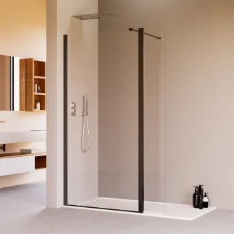 - ✅ Parete doccia con profili neri walk in con aletta terminale di 30cm ✅ Altezza 195cm ✅ Cristallo temperato spessore 8mm ✅ Trattamento anti calcare ✅ Aletta orientabile con sistema lift ✅ Ruote in ottone cromato ✅ Installabile a filo pavimento