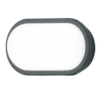 Plafonnier extérieur ovale, hauteur 14,5 cm et largeur 21,5 cm, avec diffuseur opale et structure en polycarbonate de couleur anthracite. Ampoule LED de 15 watts et 4000 kelvin incluse. Également disponible en blanc.