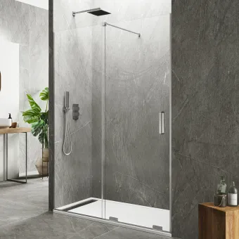 Porte de douche élégante en verre trempé anticalcaire de 8 mm, hauteur 195 cm. Manche en acier inoxydable. Roues design protégées par deux plaques en métal chromé. Cette porte de douche est équipée de composantes prestigieuses. La porte de douche sans profilés est parfaite pour ceux qui ne veulent pas de profilés visibles
