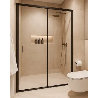 Porte de douche avec profilés noirs mats en verre de sécurité trempé anticalcaire transparent de 6 mm . Cabine de douche réversible droite ou gauche. Convient pour une installation au niveau du sol ou sur un receveur de douche, double roulements supérieur et inférieur en acier . Robuste et garantie, la porte de douche Agata sera le produit adéquat et facile à assembler